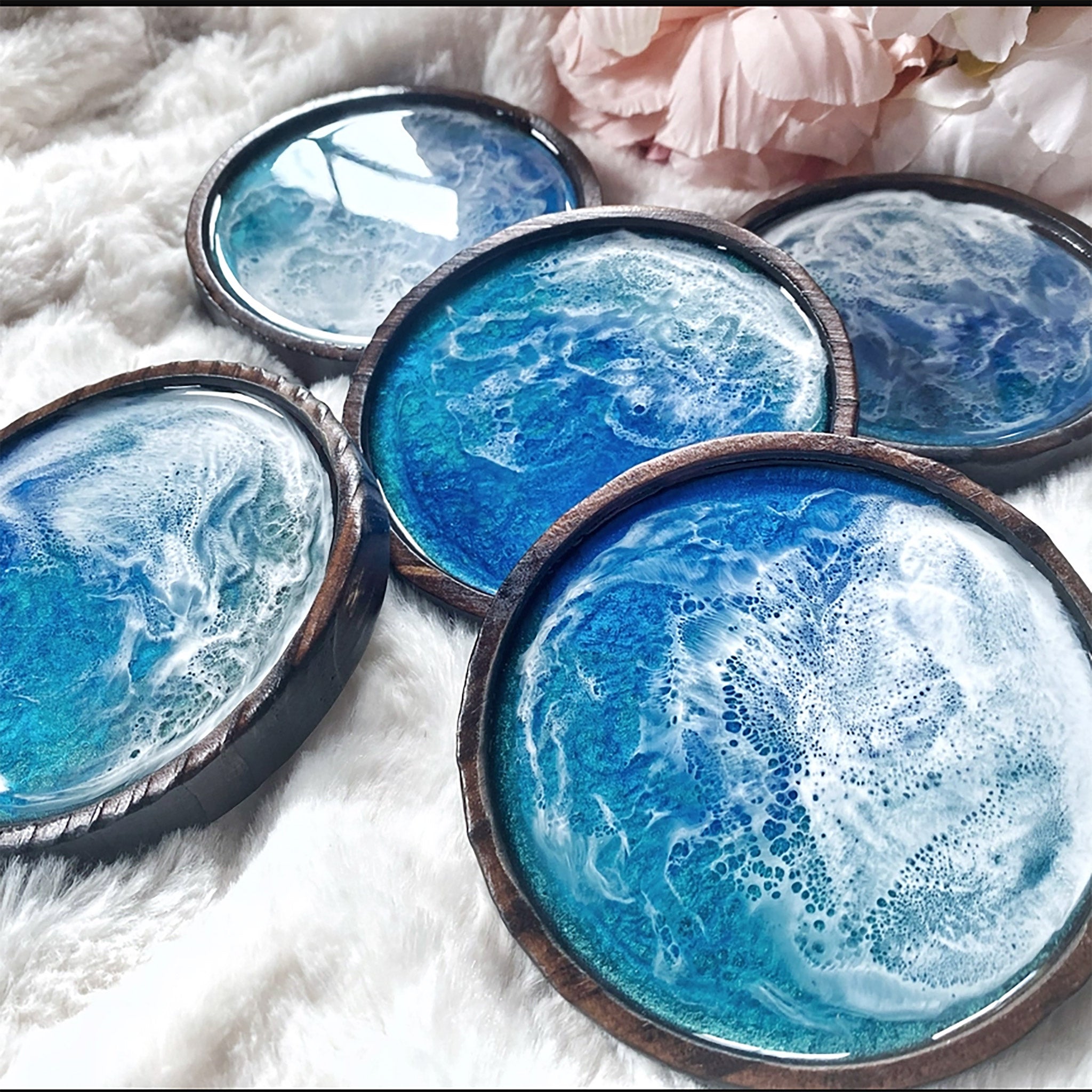 Made with food-safe, scratch-resistant epoxy resin and a subtle raised edge. No two sets are exactly alike—colors and wave patterns vary naturally.