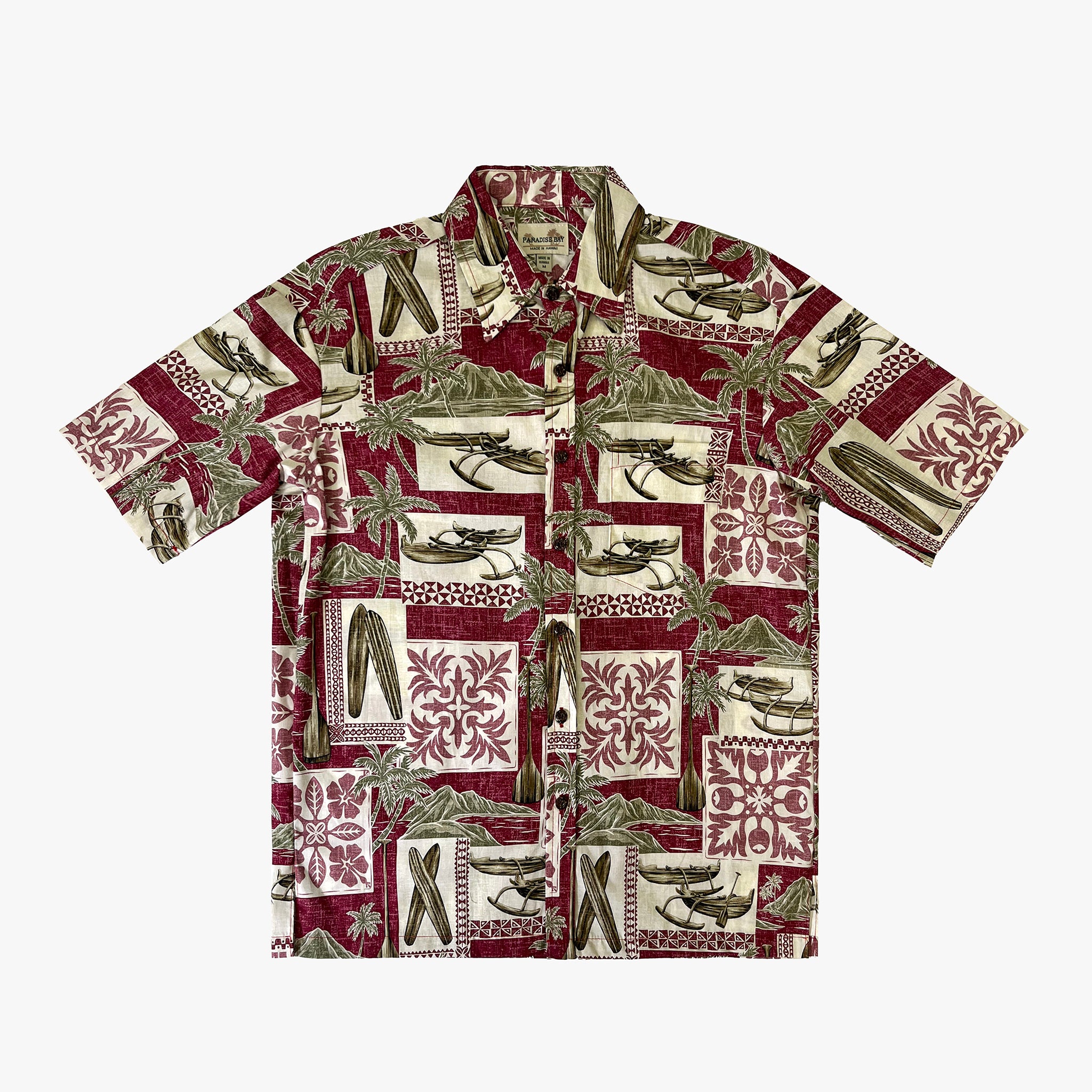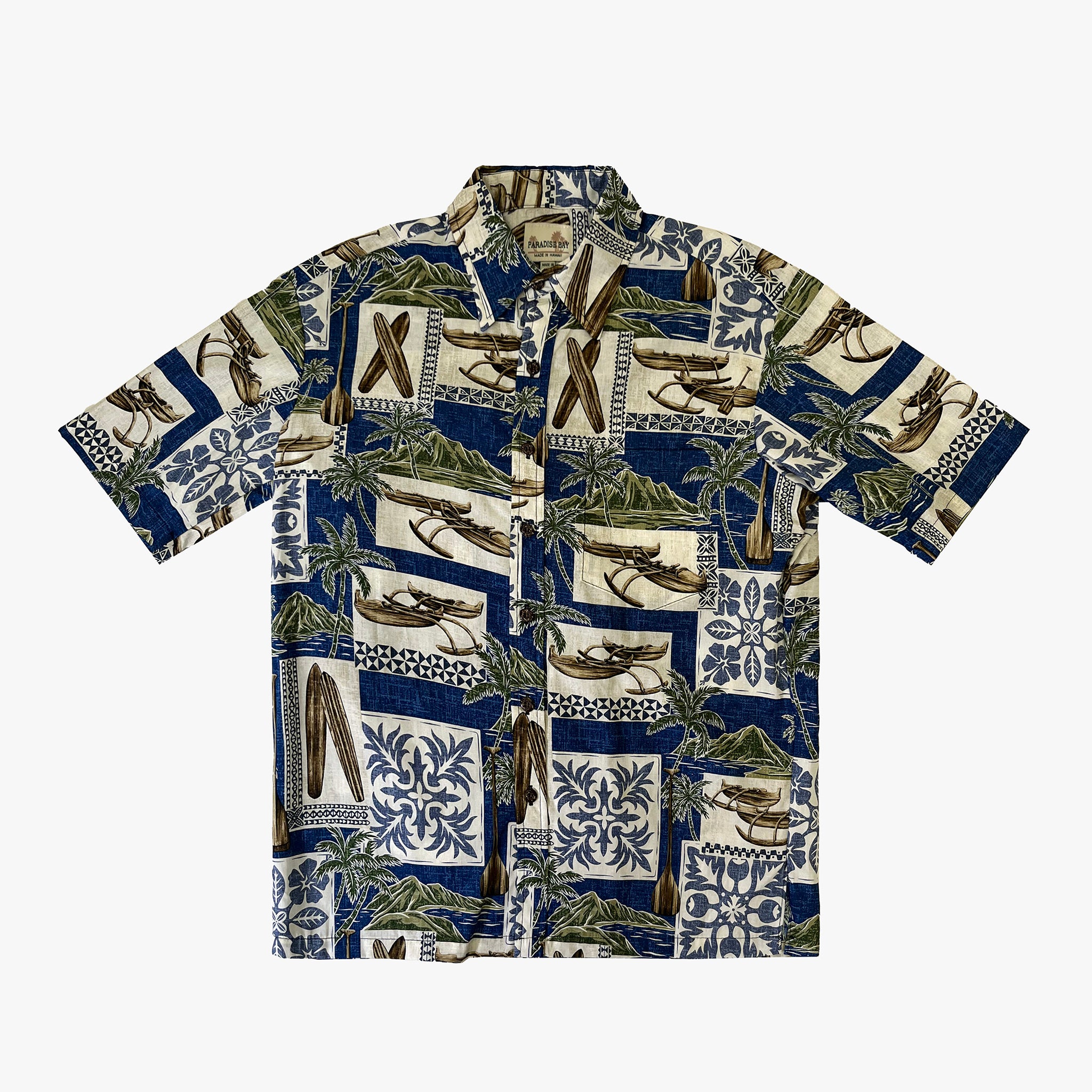 Our Quilt Canoe Reverse Print Aloha Shirt combines cool comfort with iconic Hawaiian craftsmanship, showcasing a unique reverse print inspired by traditional woodwork. Made in Hawaii from 100% cotton, this shirt offers breathable ease and authentic island style. Perfect for any occasion, it’s a timeless piece that embodies the spirit of Aloha.
