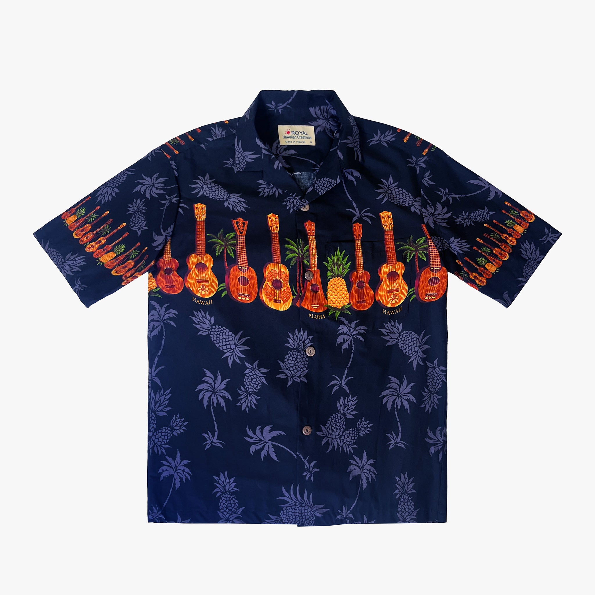 Our Ukulele Chestband Aloha Shirt captures the heart of Hawaii with its unique design featuring ukuleles, pineapples, and palm trees. Made from 100% cotton, this shirt offers breathable comfort and is perfect for any occasion, from relaxed beach days to casual gatherings. Complete with coconut buttons and a matching front pocket, it’s a timeless piece that embodies the Aloha spirit.