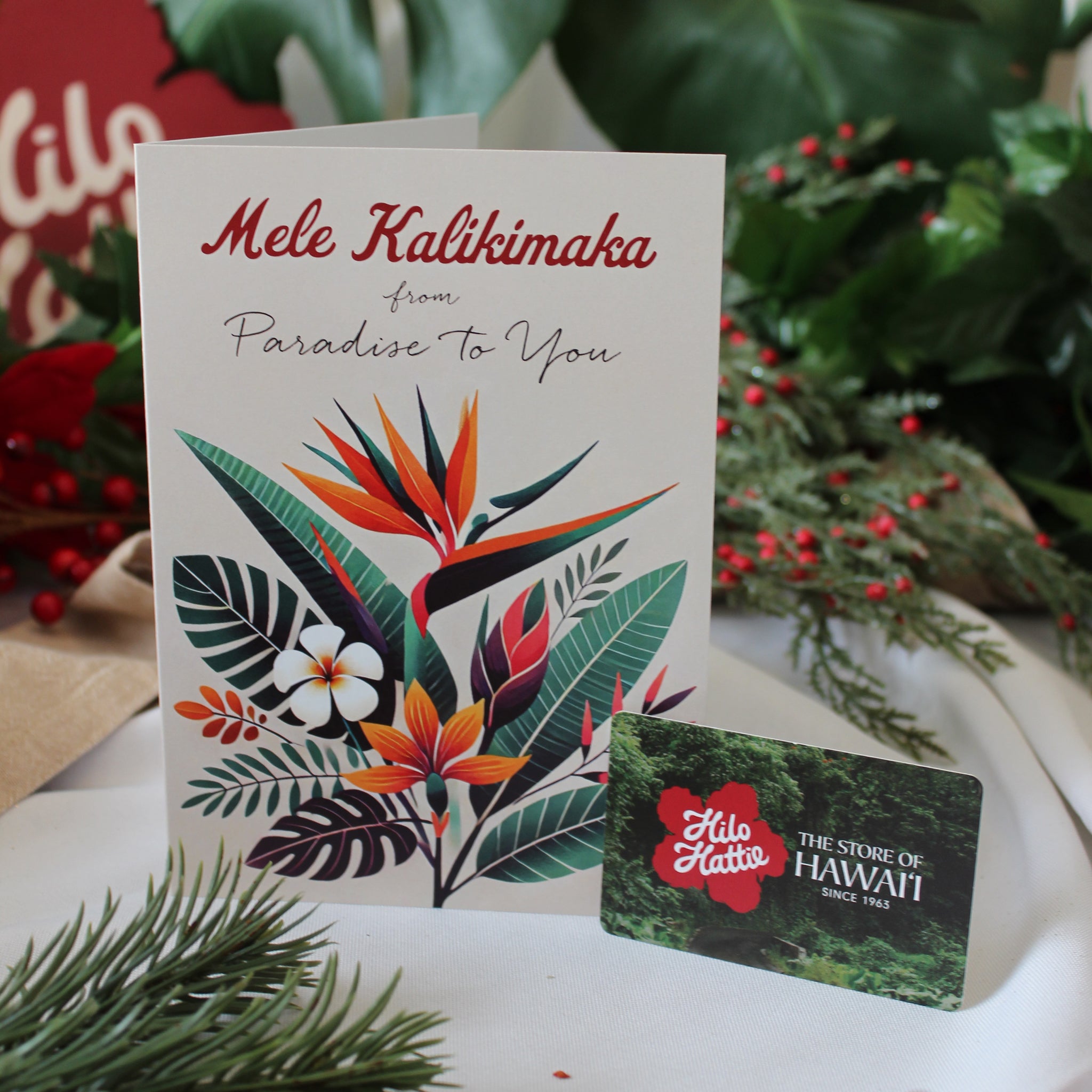 Celebrate the season with a Hilo Hattie Gift Card, bundled with a one-of-a-kind holiday greeting card. This ready-to-gift set makes giving personal and easy — the perfect way to share a little holiday joy.