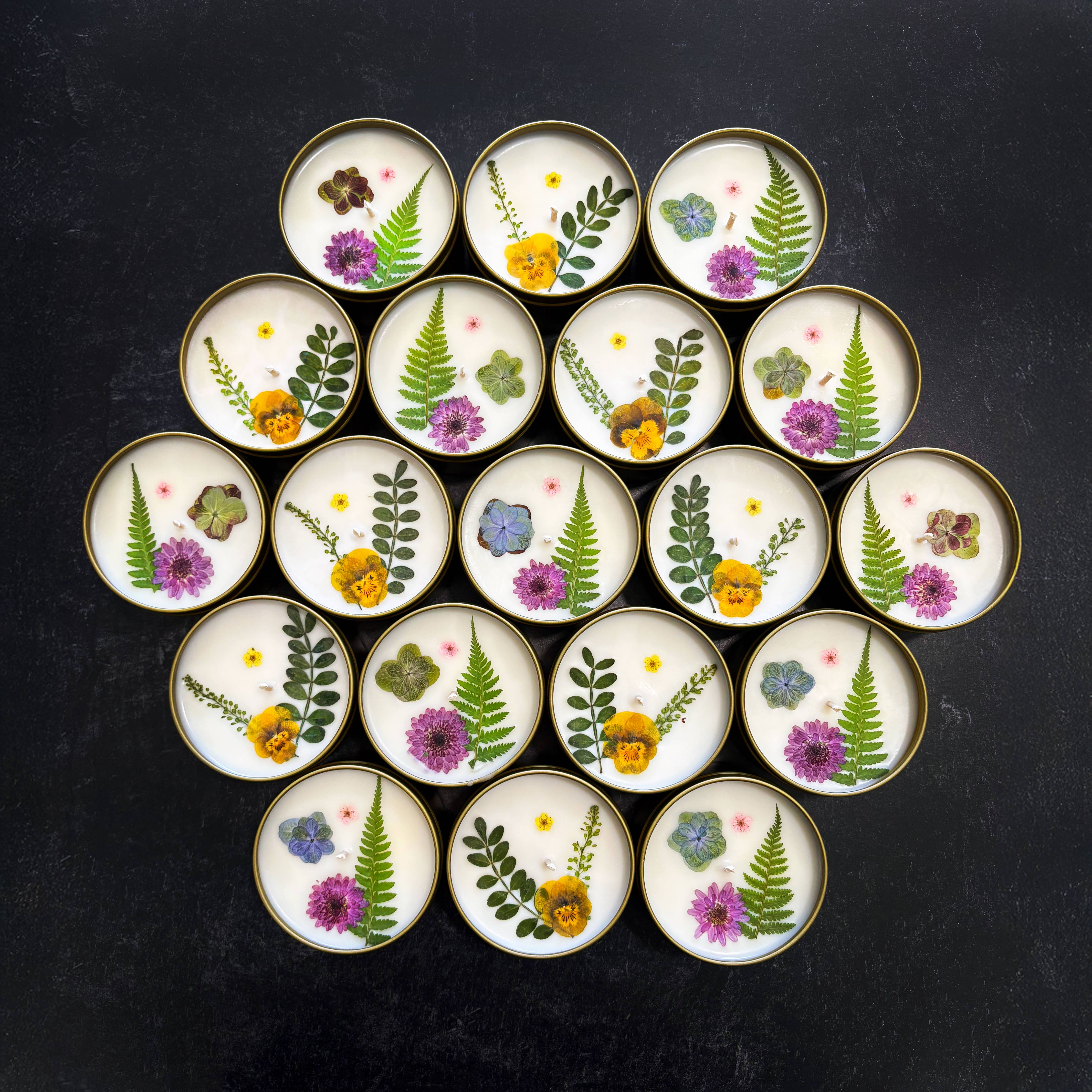 Each candle comes in a gold-finished, clear-top tin and features hand-placed botanical flowers, making every candle truly one-of-a-kind.