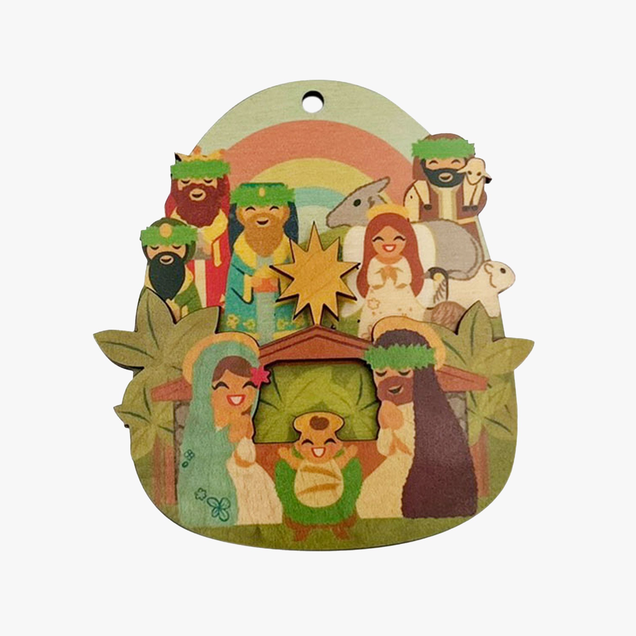 Celebrate the holiday season with the Hawaii Nativity Ornament! This beautiful ornament features a one-of-a-kind Hawaii nativity scene and a vibrant rainbow design, making it a unique addition to your holiday decor. Add it to your holiday tree and spread joy and festive spirit with this colorful and meaningful ornament Makes a great vacation souvenir or gift! Made in Hawaii, made with aloha.